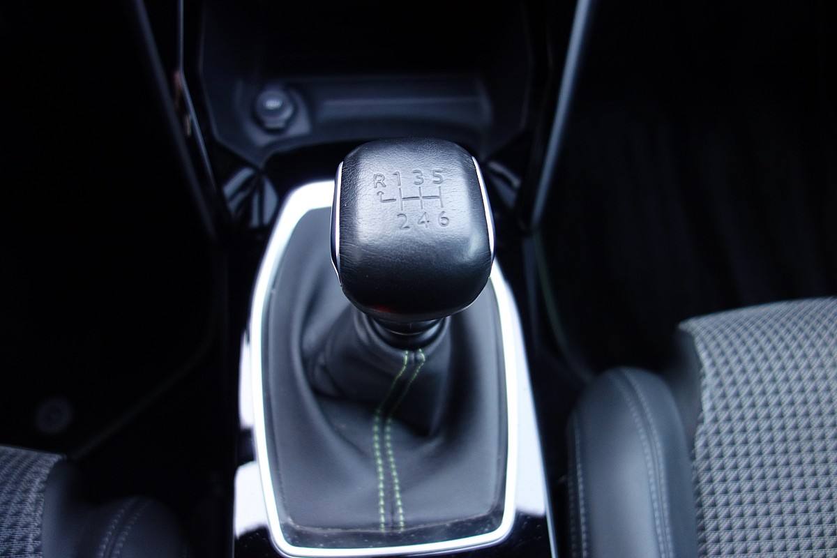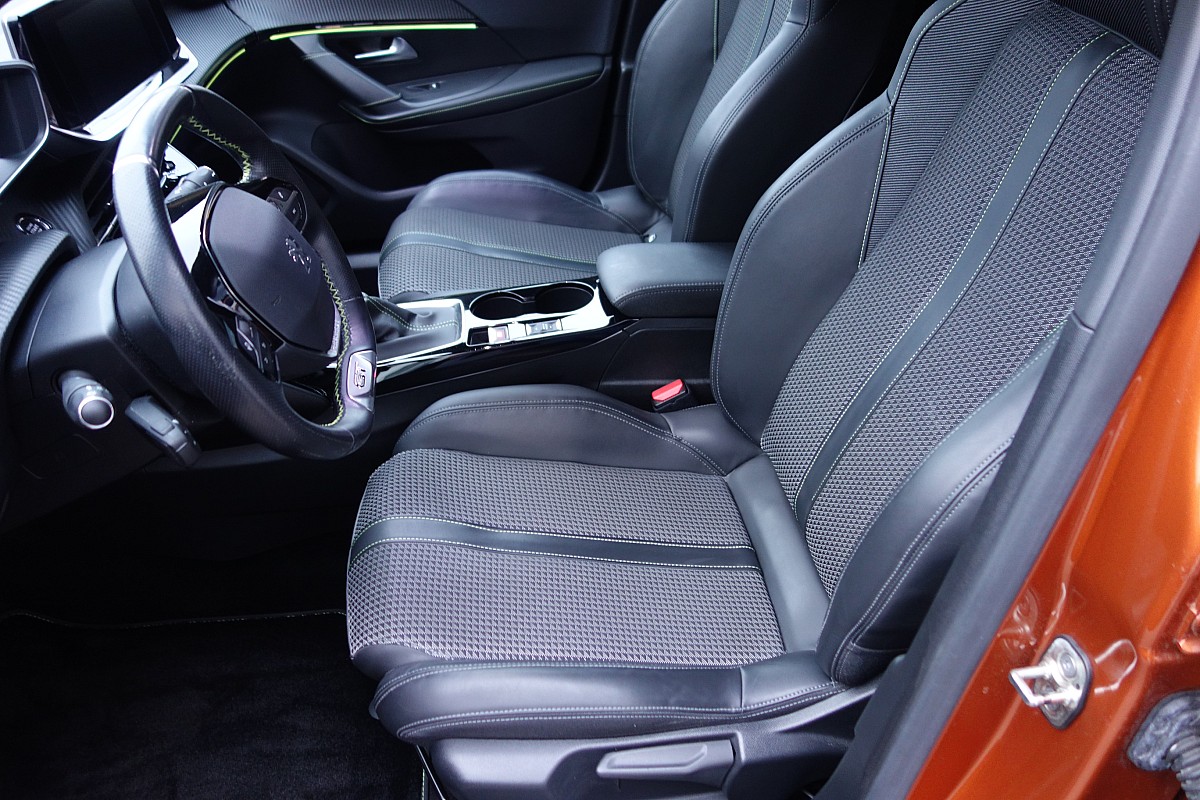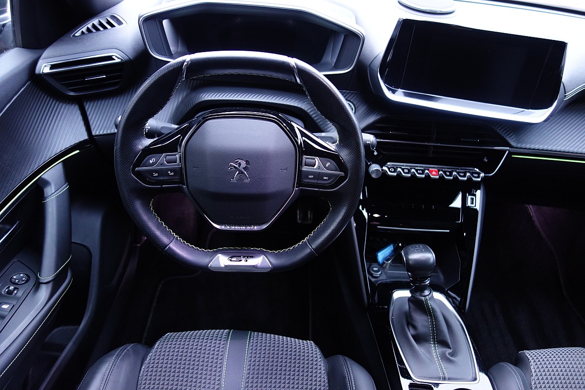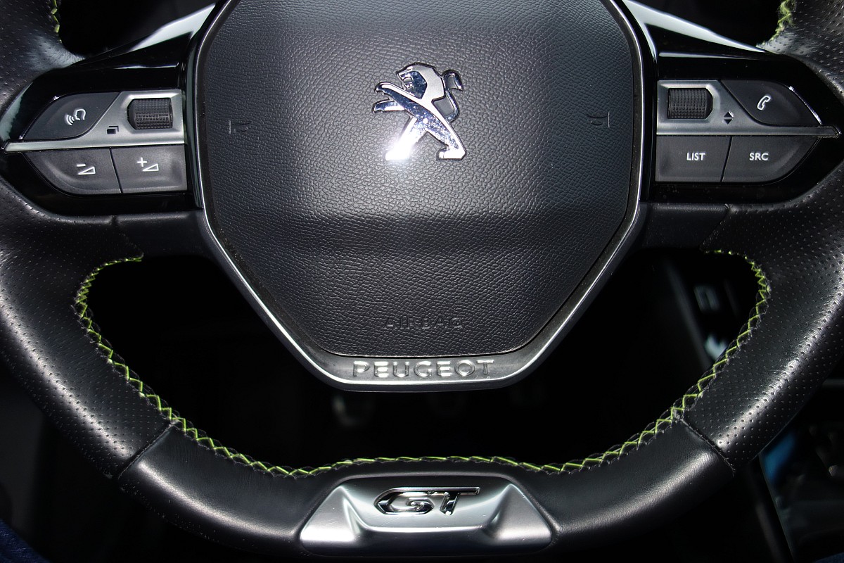 • Kompaktlenkrad aus genarbtem Leder mit grünen Ziernähten, verchromtem Löwen, Badge GT Line / GT